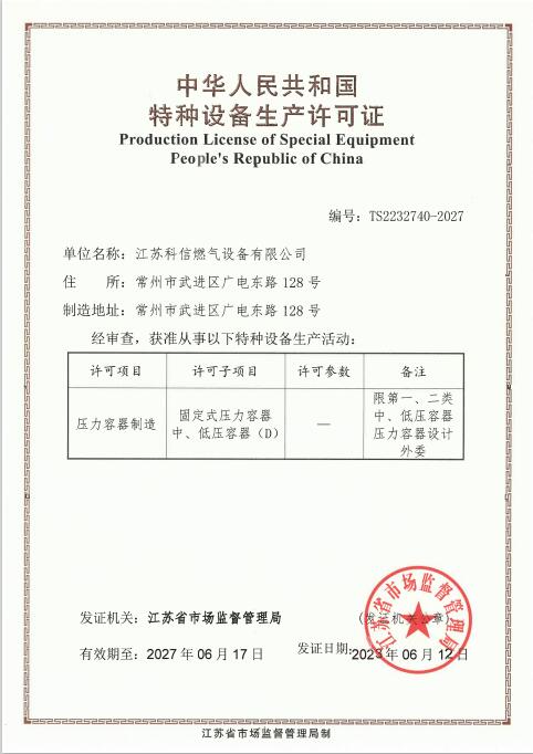 江蘇科信燃氣設備有限公司成立于1999年3月,建廠伊始,公司名稱為“常州市科信燃氣設備有限公司”,為適應公司持續發展的需求,于2014年正式更名為“江蘇科信燃氣設備有限公司”。自公司成立以來,科信一如既往專注于城市燃氣管網的配套建設和發展提供調壓設備及研究開發相關產品。